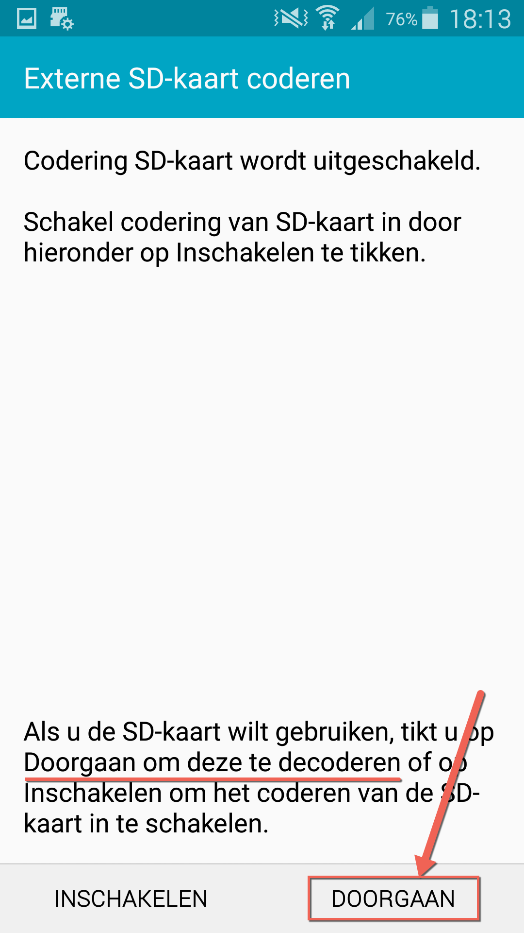 Je krijgt nu twee opties. De eerste is om je SD-kaart te coderen (dus beveiligen) en de andere optie is om hem de decoderen. Dit laatste moet je doen. Dus kies voor doorgaan om je SD-kaart te decoderen.