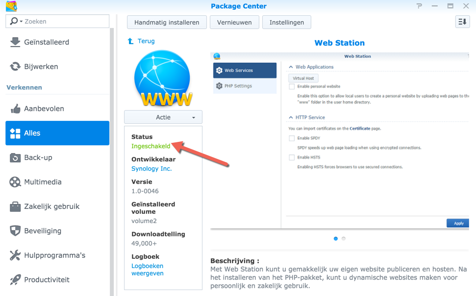 Eenmaal ingelogd op je Synology NAS moet je zorgen dat Web Station staat geïnstalleerd. Dit is een vereiste om het certificaat werkend te krijgen.  Mocht dit nog niet het geval zijn dan kun je navigeren naar Package Center -> Alles -> Web Station. Zorg dat deze geïnstalleerd is.
