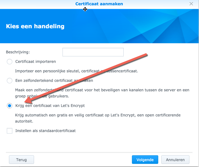 Kies nu de derde optie in het rijtje, namelijk Krijg een certficaat van Let’s Encrypt en klik op volgende.